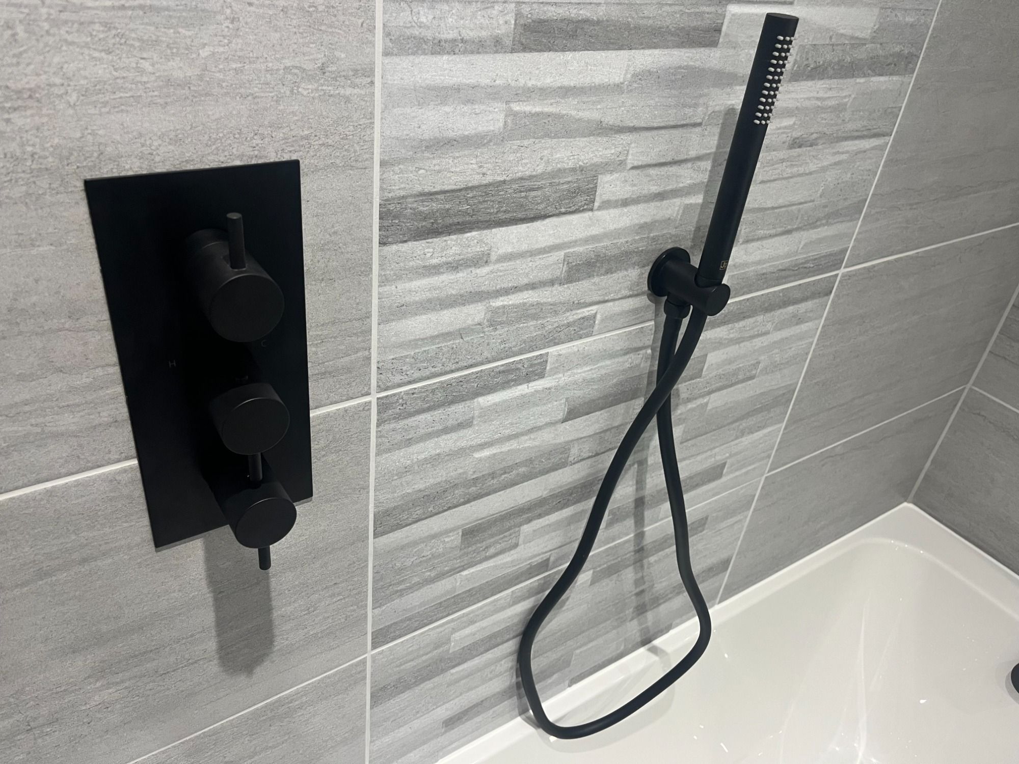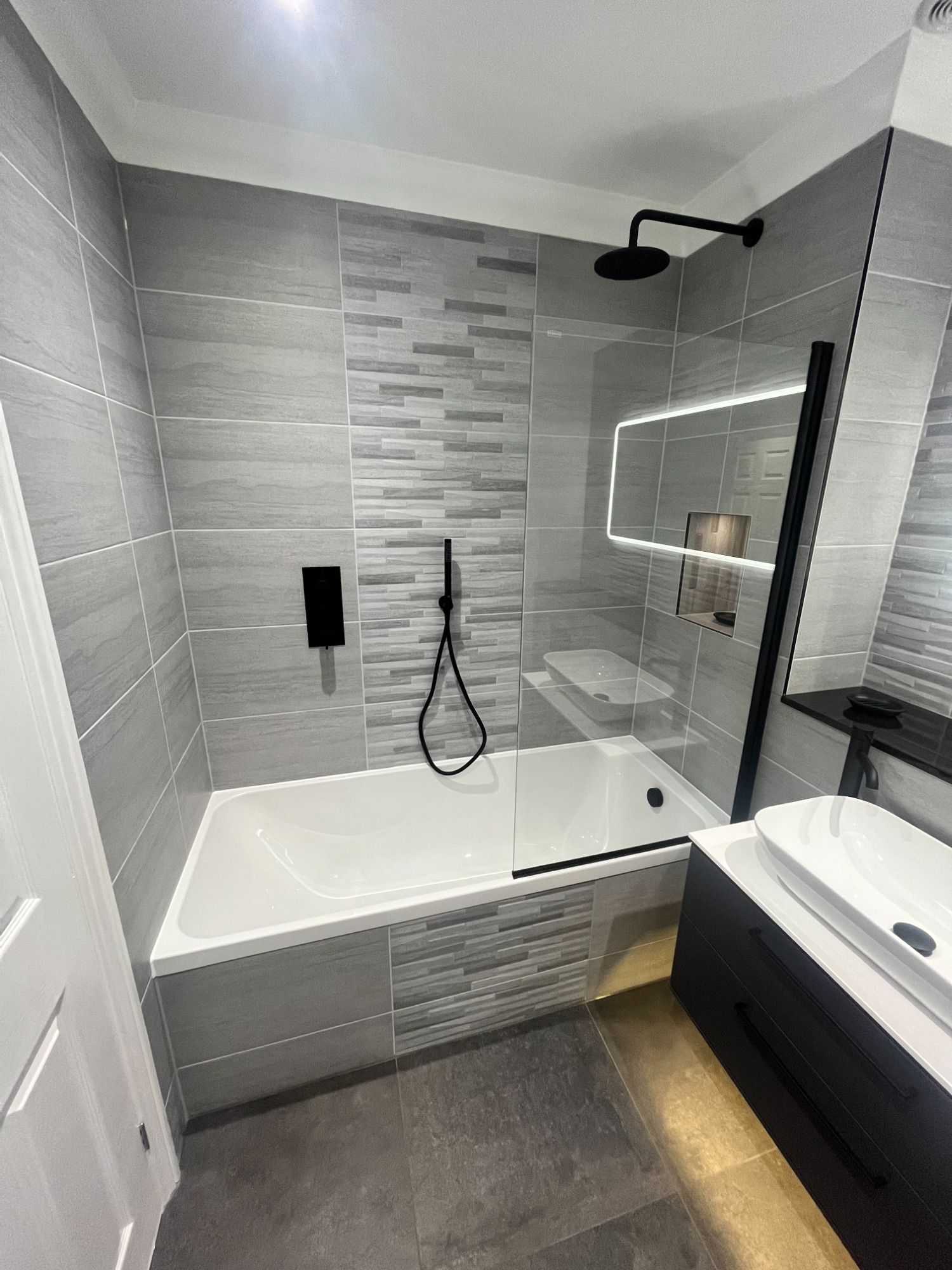 A Modern look, incorporating the stunning matt black brassware and sit on bowl. Also great use of the feature split face tiles