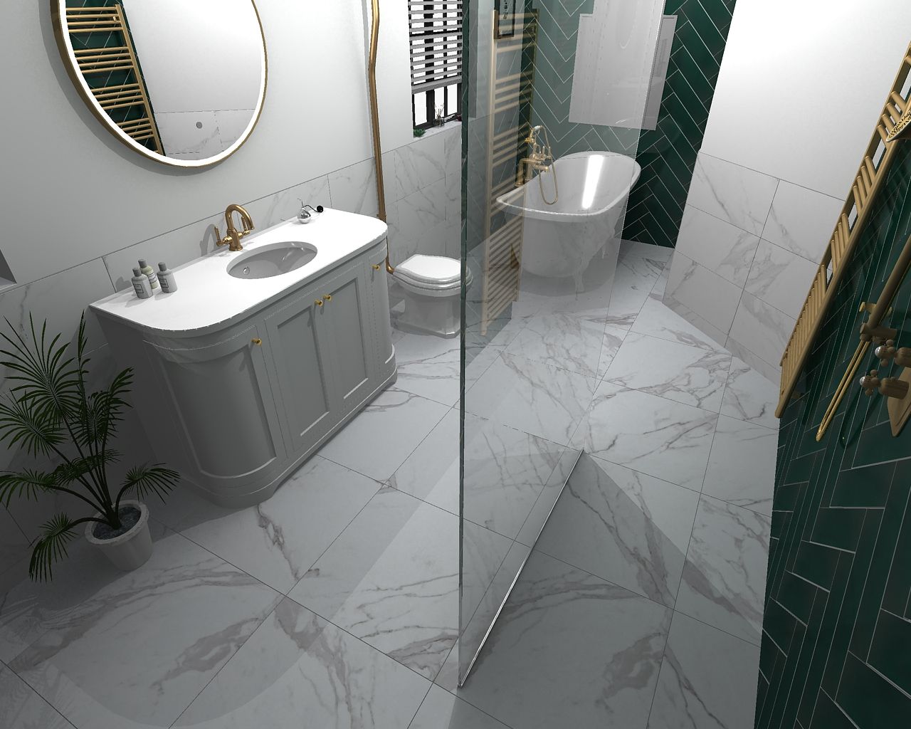 Transform your home with a beautiful ensuite featuring a luxurious walk-in shower, a statement freestanding bath, and an elegant high-level WC. The space is adorned with stunning green metro tiles, adding a vibrant yet classic touch. Central to the design is a classic marble double curved basin vanity unit, blending timeless elegance with modern functionality. This ensuite promises a sanctuary of style and comfort, perfect for unwinding in pure luxury.